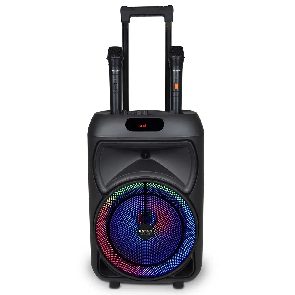 Speaker portatile ideale per feste, karaoke e animazione. Dotato di 2 microfoni wireless, luci LED frontali a effetto spettacolare, connessione Bluetooth e molteplici ingressi audio. Grazie al trolley con ruote può essere trasportato facilmente ovunque.