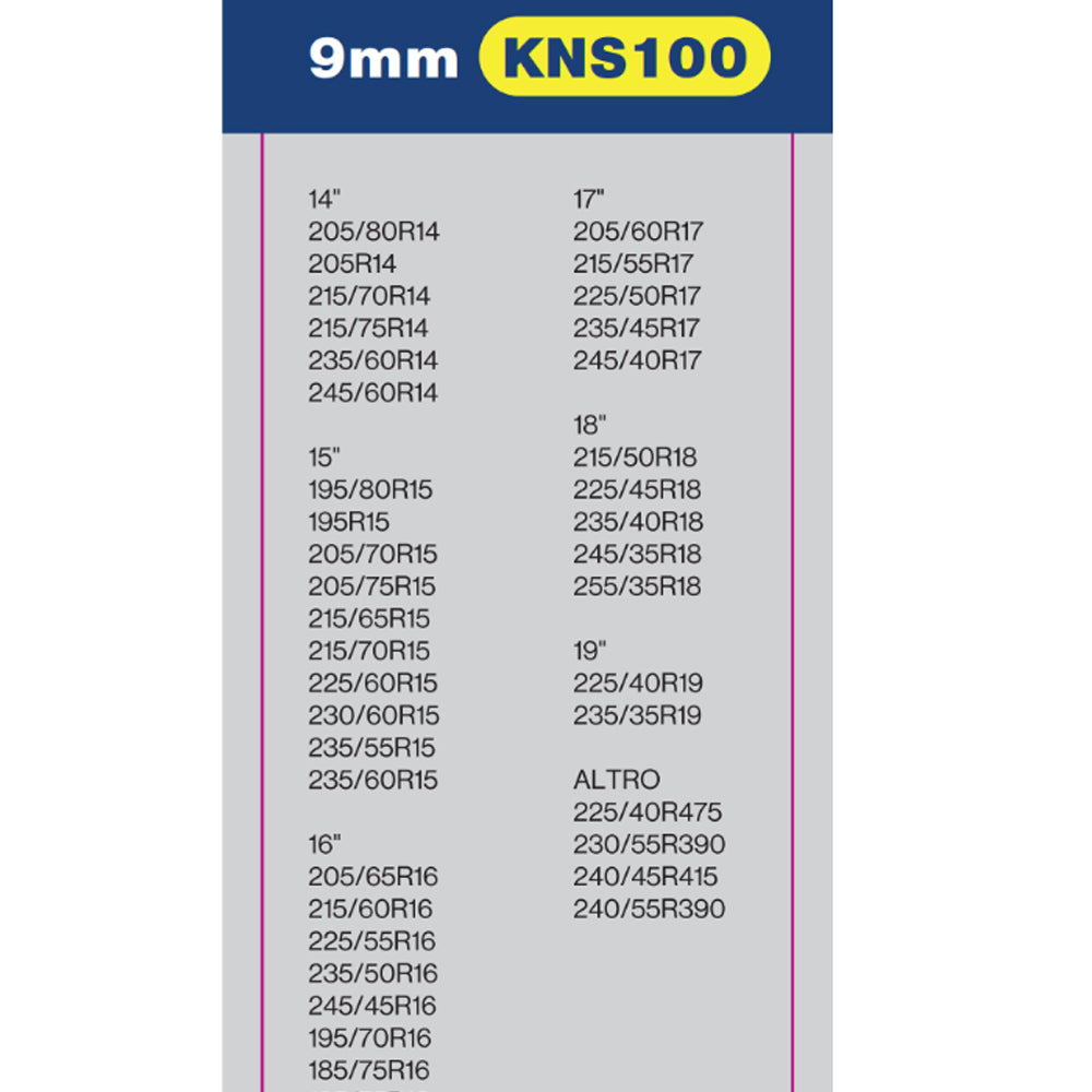 Le catene da neve KNS100 sono catene a rombo da 9 mm in acciaio legato, pensate per migliorare la trazione su neve e ghiaccio. Sono utilizzabili anche su veicoli con ABS e con pneumatici ribassati. Prima del viaggio è consigliata una prova di montaggio e smontaggio, così da verificare il corretto posizionamento. In marcia, procedi con prudenza evitando manovre brusche e non superare i 50 km/h. Dopo l’uso, lavale, asciugale accuratamente e riponile in un luogo asciutto.