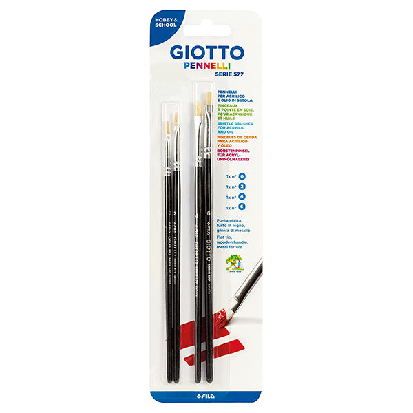 Set 4 pezzi di pennelli Giotto Serie 577 n. 0-2-4-6. Ideale per acrilico e olio. Punta piatta in setola. Manico in legno verniciato nero.