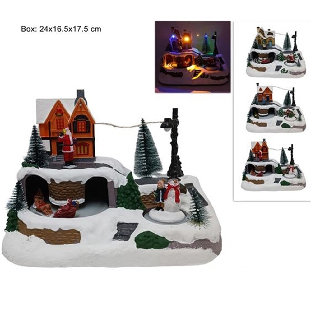 Questo villaggio natalizio luminoso raffigura Babbo Natale accanto a una casetta innevata, con alberi e figure che richiamano le atmosfere di montagna. Le luci LED colorate creano un effetto suggestivo, perfetto per rendere il tuo Natale ancora più magico e accogliente.