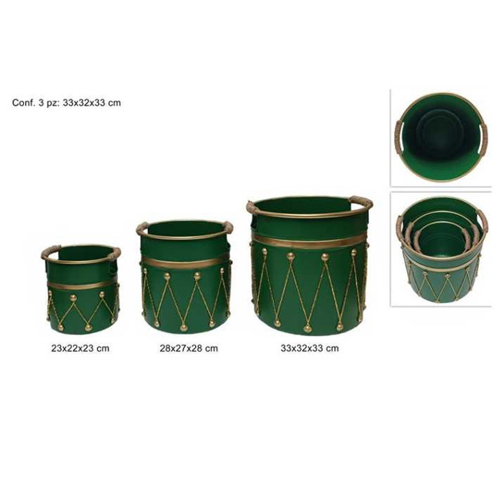 Elegante set di 3 contenitori decorativi in metallo verde con finiture dorate e manici in corda. Ideali come complementi d’arredo natalizi, portavaso o per composizioni scenografiche in vetrina, casa o negozio.