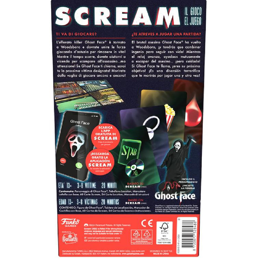 Contenuto Figurina di Ghost Face, tabellone, carte Scream, carte ambiente, segnalino primo giocatore a forma di coltello, app companion integrata. :contentReference[oaicite:3]{index=3}