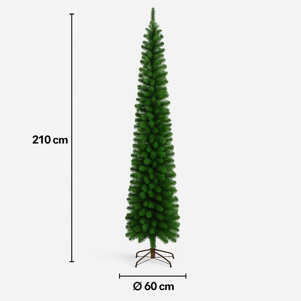 Albero di Natale Norway Slim 210 cm, elegante e realistico, Ø 60 cm con 425 rami fitti. Un albero alto e slanciato che dona maestosità senza occupare troppo spazio.
