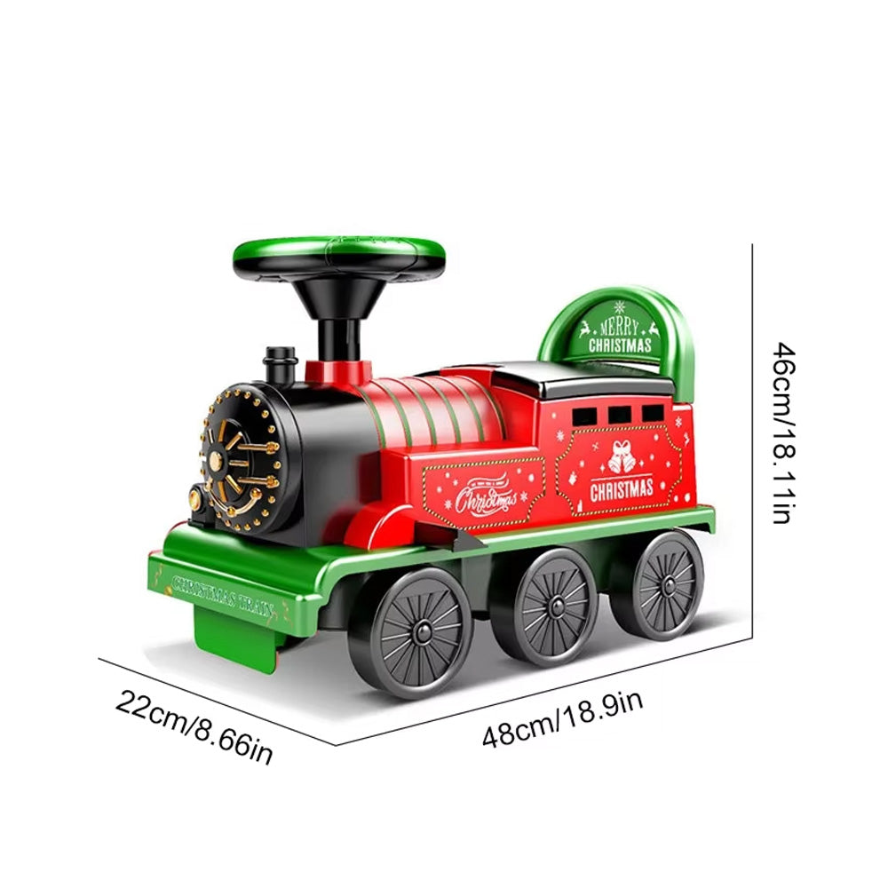 Divertente trenino natalizio cavalcabile per bambini, decorato nei classici colori rosso e verde con dettagli dorati. Un gioco perfetto per ricreare la magia del Natale, sviluppare la motricità e vivere momenti di allegria in famiglia.