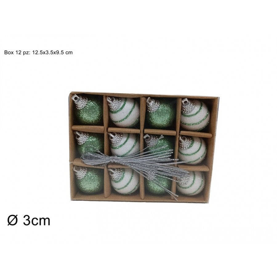 Palla di Natale, 3cm, in box da 12 pezzi. Colore Verde/Bianca.